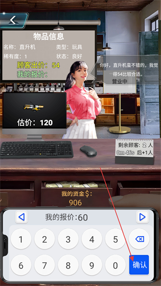2、针对顾客出价的物品如直升机玩具,顾客出价54,结合物品估价120,输入你的报价如60,点击确认。