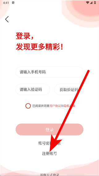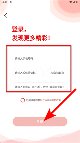 4、输入手机号码,点击获取验证码,输入短信验证码,设置新密码,勾选后,点击注册。