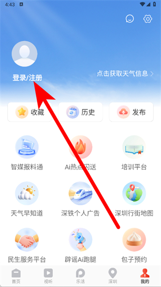 2、在我的页面,点击登录注册选项,进入登录页面。
