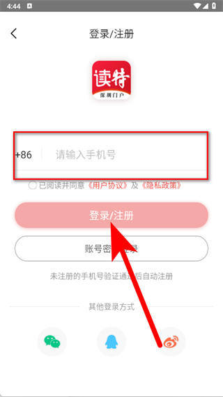 3、在登录注册页面,输入手机号,勾选同意协议后,点击登录注册按钮。