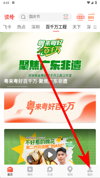 1、打开读特,点击底部导航栏最右侧的我的,进入个人页面。