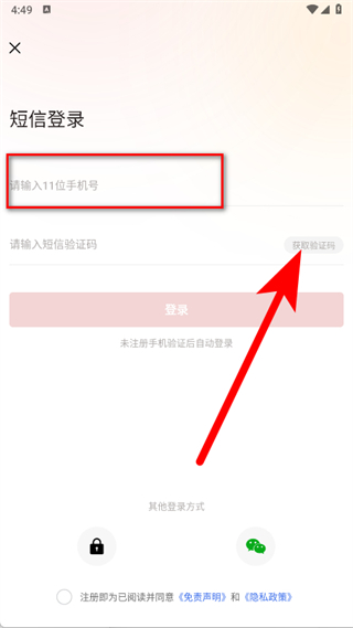 3、进入短信登录页面,输入手机号码,点击获取验证码。