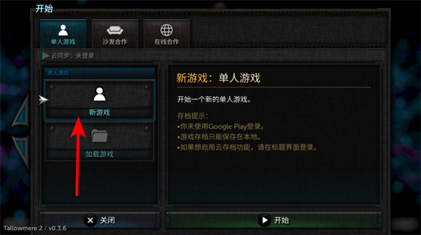 4、在游戏开始界面,选择单人游戏模式下的新游戏,开启单人冒险,新手可借此熟悉玩法,积累资源,逐步解锁游戏内容。