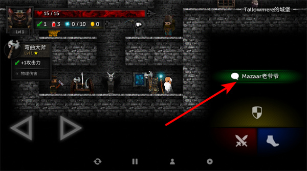 2、在地牢中,遇到Mazaar老爷爷时,可与其交互,同时关注角色装备的弯曲大斧,其+1攻击力属性能提升初期战斗能力,助力地牢探索。