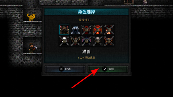 1、进入游戏后,在角色选择界面,可选猫兽角色,其拥有+10%移动速度特性,点击选择按钮确认,该角色移速优势利于地牢快速探索。