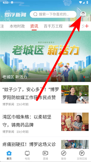 1、打开兴宁罗浮新闻,点击页面右上角的个人图标,进入个人中心页面。