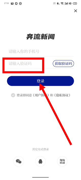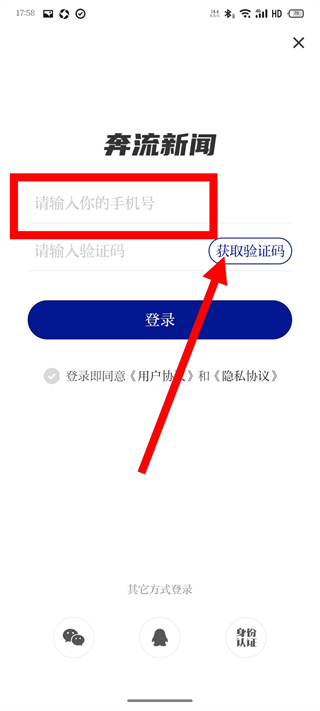 3、在登录页面,输入手机号码,点击获取验证码。