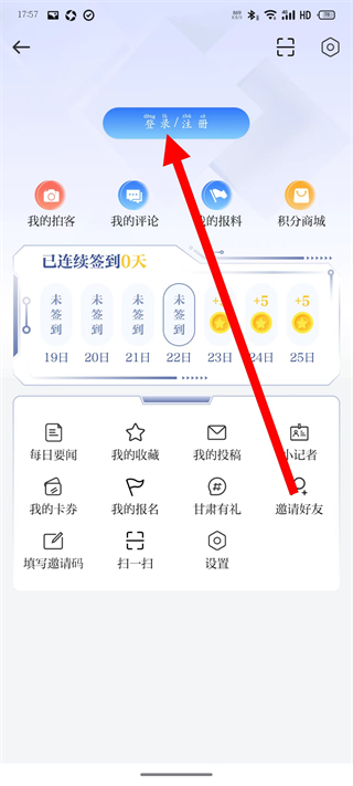 2、在个人页面,点击登录注册选项,进入登录页面。