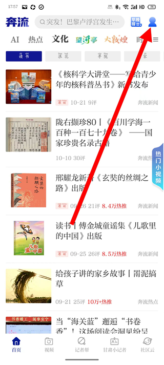1、打开奔流新闻,点击页面右上角的个人图标。