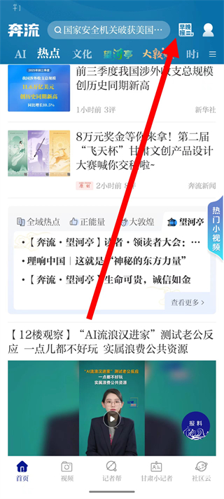 1、打开奔流新闻,点击右上角图标,进入早晚报页面。