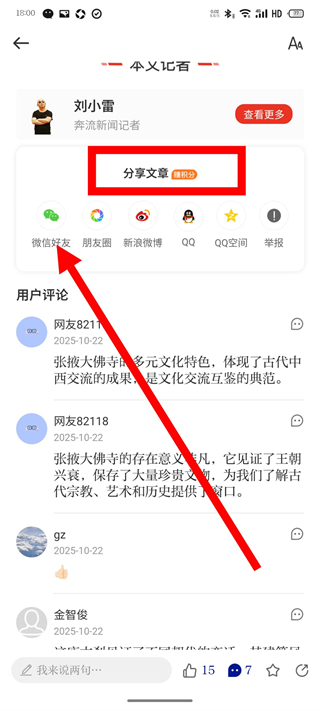 4、看完文章点击分享按钮,可选择将文章分享至微信好友、朋友圈等平台。