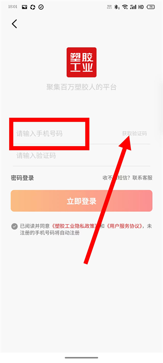 3、进入登录页面后,输入手机号码,点击获取验证码。
