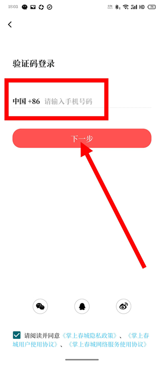 3、进入验证码登录页面,输入手机号码,点击下一步。
