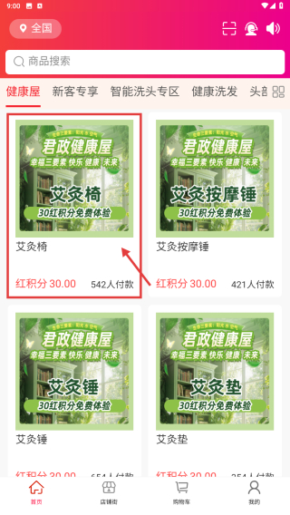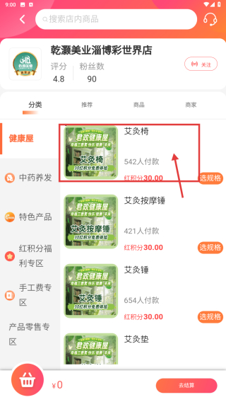 2、在健康屋商品列表页面,找到艾灸椅商品条目,点击进入店铺商品页面。