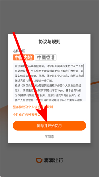 1、打开滴滴出行,在弹出的协议与规则窗口中,仔细阅读后,点击同意并开始使用。