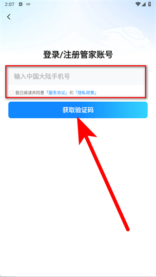 3、在登录注册页面,输入中国大陆手机号,勾选协议后,点击获取验证码。