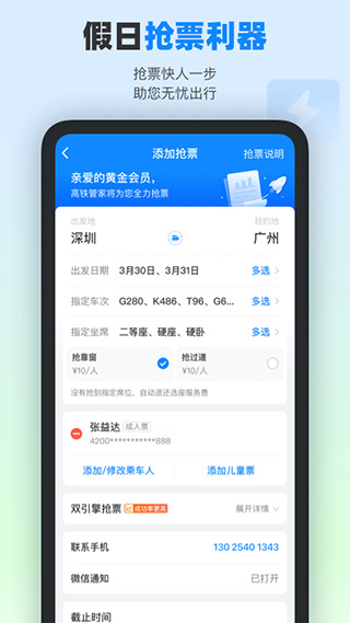 针对热门车次余票紧张问题,提供余票监控与多车次同时抢票服务,支持提前设置预约抢票提醒,放票时自动提交订单,提升高峰时段购票成功率。