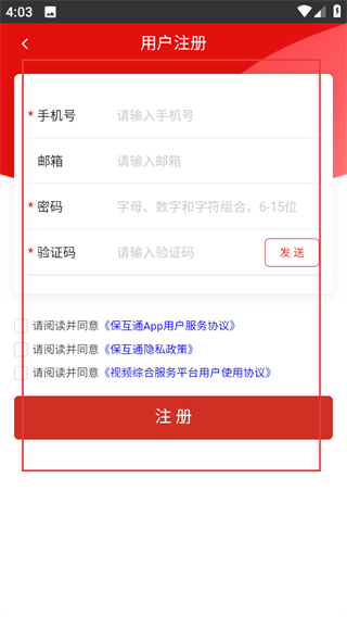 3、在用户注册页面,填写信息,同意协议后点击注册可完成账号注册。
