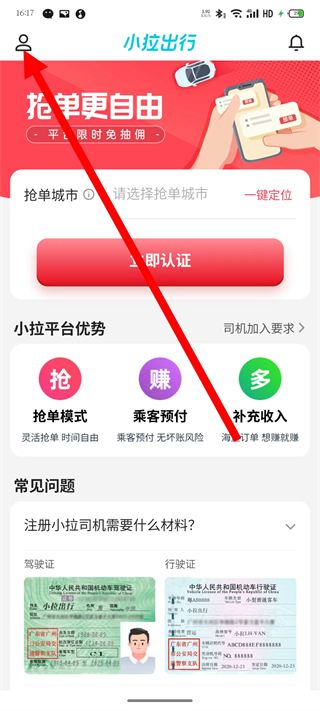 1、打开小拉出行司机端,点击左上角个人图标,展开个人功能栏。