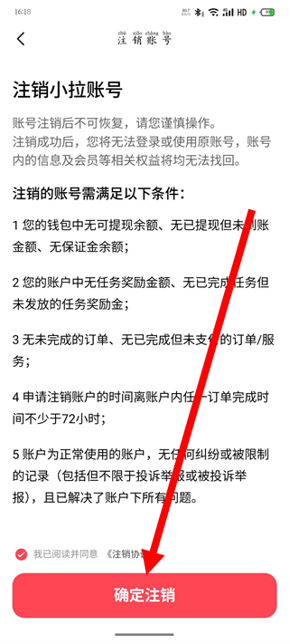 5、仔细阅读账号注销条件,勾选后,点击确定注销,完成账号注销操作。