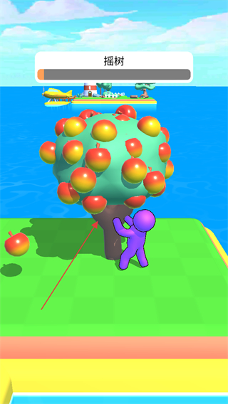 1、操作紫色角色摇树,收获苹果,积累水果资源。
