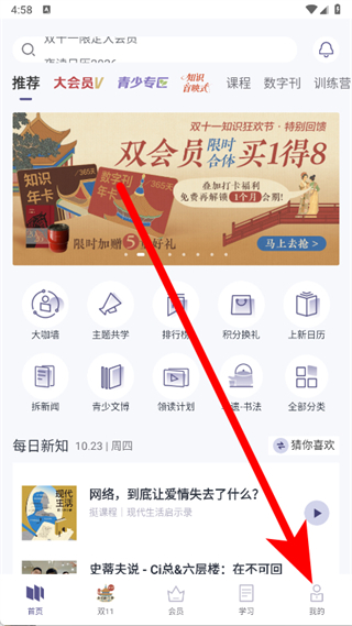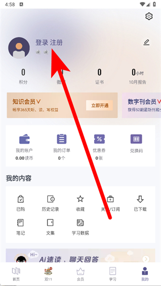 1、打开三联中读,点击页面底部的我的,进入个人页面。