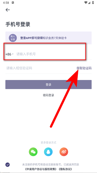 3、输入手机号码,点击获取验证码按钮以获取短信验证。