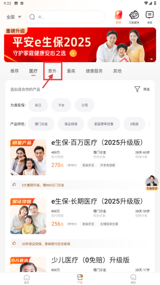 2、在保险服务页面,点击意外标签,浏览意外保险产品列表。
