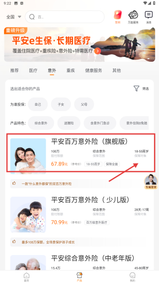 3、在意外保险产品列表里,找到平安百万意外险旗舰版产品条目,点击进入产品详情页。