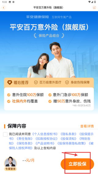 4、在产品详情页,查看保障内容后点击立即投保按钮,完成保险投保操作。