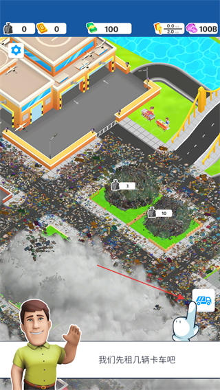 1、点击界面提示的按钮,租赁卡车,开启垃圾清理工作。