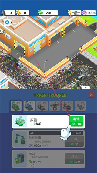 2、在车辆列表中,点击聘请,招募垃圾清理车辆,提升清理能力。
