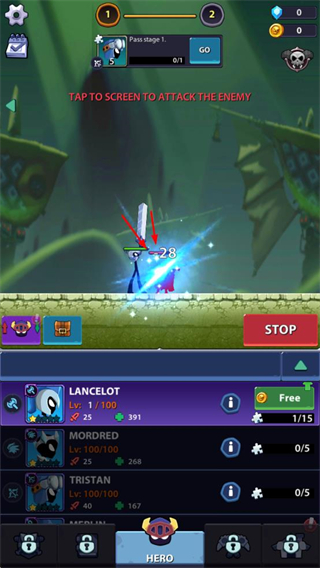 1、点击屏幕操控英雄攻击敌人,开启战斗冒险之旅,积累战斗成果。