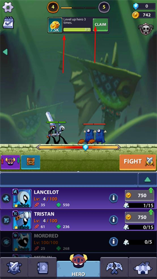 4、领取英雄升级收益,提升英雄等级,增强战斗能力,推进关卡进程。