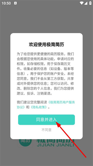 1、在欢迎使用极简简历弹窗中,点击同意并进入,进入首页。