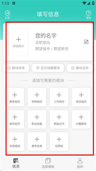 3、在填写信息页面,可填写姓名、求职意向等个人信息,并添加教育经历、工作经历等模块内容。