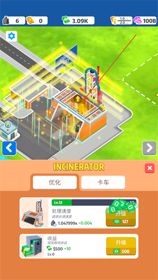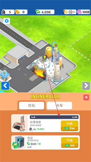 2、在焚烧厂界面,点击升级处理速度,提升垃圾处理效率。