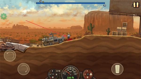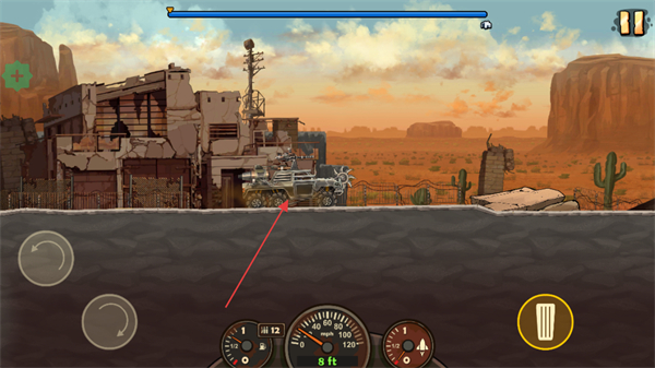 1、驾驶改装车辆在荒漠场景中行驶,探索地图,寻找僵尸和障碍物。