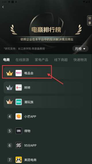 3、在排名列表里,找到唯品会条目,点击进入品牌主页。