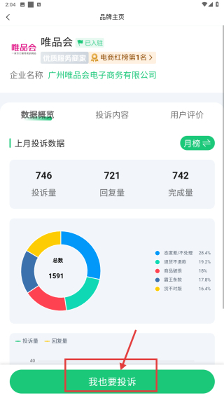 4、在品牌主页,点击我也要投诉按钮,发起对唯品会的投诉操作。