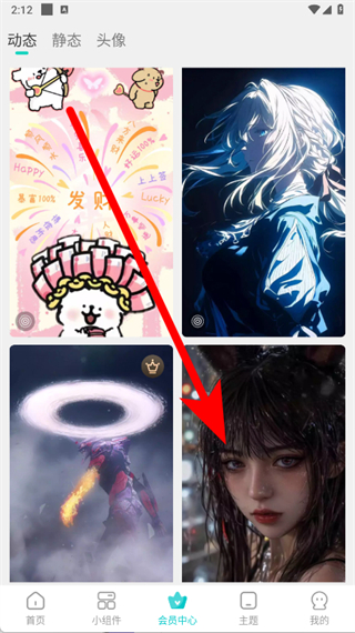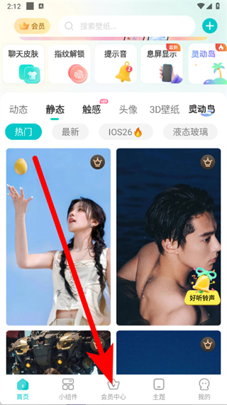 1、打开主题壁纸大全,点击底部的会员中心,进入会员中心页面。