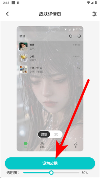 4、在皮肤详情页,点击设为皮肤按钮,将该壁纸设置为聊天皮肤。