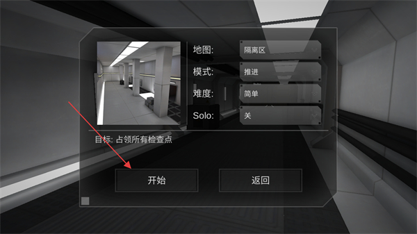 1、选择地图如隔离区、模式推进、难度简单等,点击开始进入游戏,目标占领所有检查点。