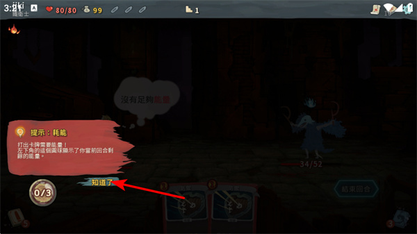 3、遇到没有足够能量提示时,点击知道了按钮,这是关闭提示的基础操作,关闭后需调整出牌策略,优先低能量消耗卡牌。