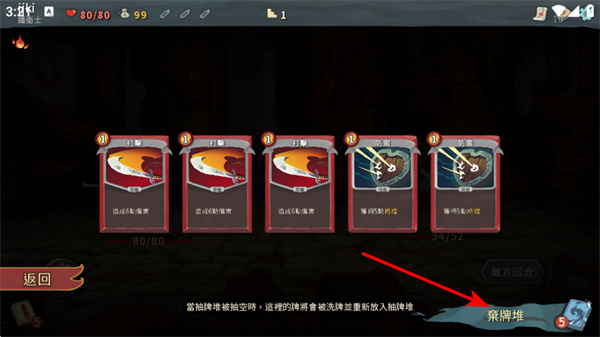 2、当抽牌堆抽空时,点击弃牌堆按钮,这是补充手牌的关键操作,弃牌堆会重新洗入抽牌堆,为玩家提供新的卡牌选择。