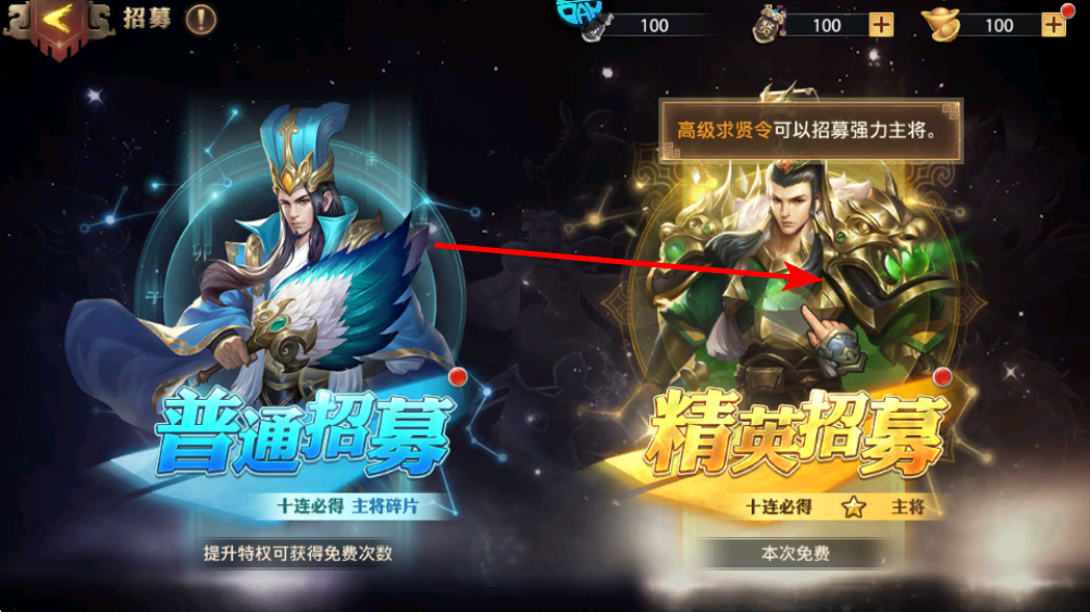 3、在招募模式选择界面,点击精英招募选项,这是获取强力主将的关键操作,该模式招募概率高于普通招募,能更快提升阵容实力。