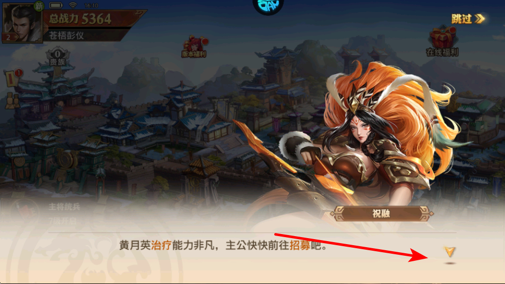 4、进入游戏主界面后,点击下方招募指引按钮,这是开启武将招募玩法的基础操作,点击后可进入招募系统,开启武将获取流程。