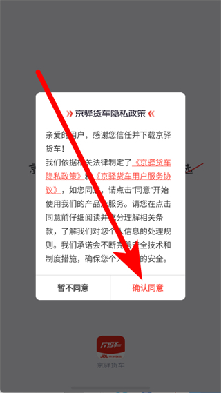 1、打开京驿货车,在隐私政策弹窗中点击确认同意。