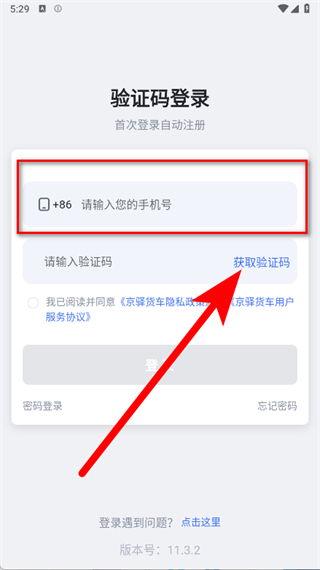 3、在验证码登录页面,输入手机号,点击获取验证码。