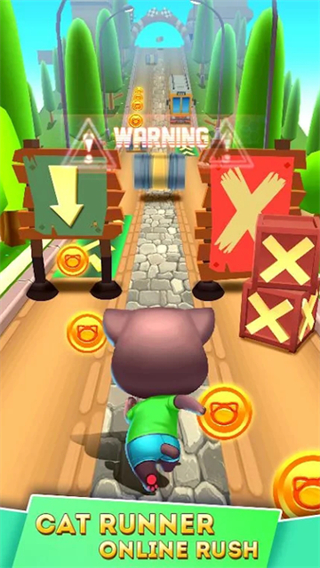 仅需通过滑动屏幕控制小猫左右移动与跳跃,操作简单易上手,无需复杂技巧,新手也能快速掌握跑酷节奏。